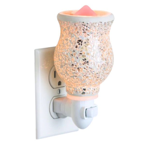 Our Pluggable Wax Warmers by Candle Warmers are decorative and versatile fragrance warmers. They can be used with any outlet, both vertically and horizontally, by twisting the plug base. Ideal for above counter outlets in small room spaces. The silver glass mosaic surface of this Pluggable Warmer shines & sparkles as it emits a soft glow. Add a piece of your favorite fragrance wax melts to the warming dish and turn on using the easy on/off switch in the front. NP5 Bulb included.