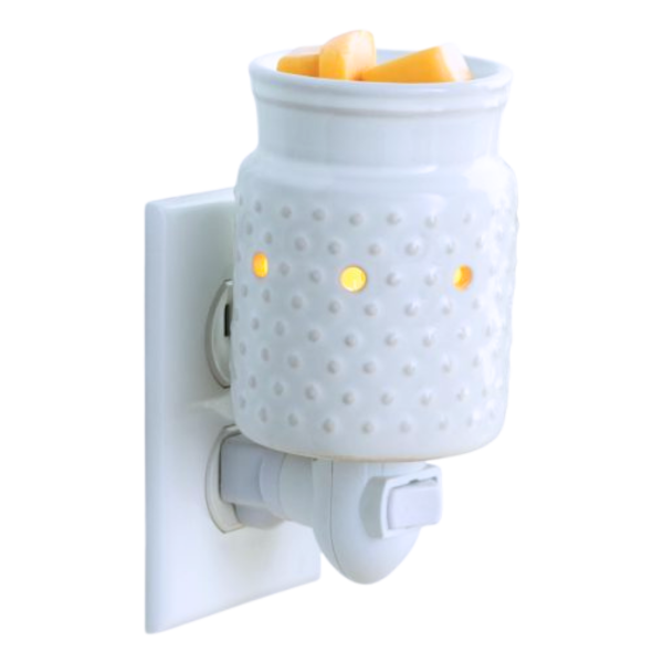 Our Pluggable Wax Warmers by Candle Warmers are decorative and versatile fragrance warmers. They can be used with any outlet, both vertically and horizontally, by twisting the plug base. Ideal for above counter outlets in small room spaces. Classic hobnail pattern in white is reminiscent of depression glass and classic milk glass with a modern take. Add a piece of your favorite fragrance wax melts to the warming dish and turn on using the easy on/off switch in the front. NP5 Bulb included.